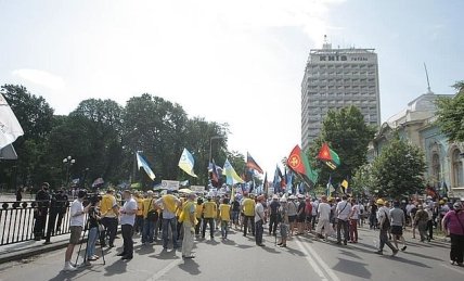 Федерация профсоюзов Украины проводит в Киеве акцию против принятия законопроекта "О внесении изменений в некоторые законодательные акты Украины (относительно отдельных вопросов деятельности профессиональных союзов)" (№2681).