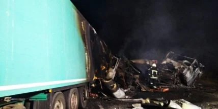 На место прибыли три отделения спасателей. На месте было установлено, что столкнулись грузовой автомобиль с полуприцепом (марка и государственный номер устанавливается) с грузовым автомобилем MAN TGA с полуприцепом. В результате ДТП второй автомобиль перевернулся, кабины обоих транспортных средств загорелись.