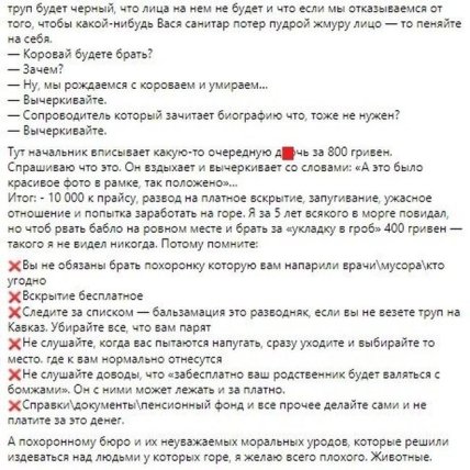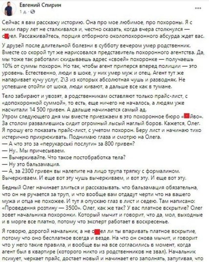 По его словам, тело увезли, а родственники умершего получили на руки прайс, где им насчитали за услуги похоронного агентства почти 15 тысяч гривен. Позже Спирин описывает процесс "переговоров" в похоронном бюро и что в результате от стартовой цены удалось списать ненужных услуг на 10 тысяч. Показательным является момент, что бесплатное вскрытие клиентам пытались продать за 3,5 тысячи гривен. Приводим рассказ от первого лица целиком.