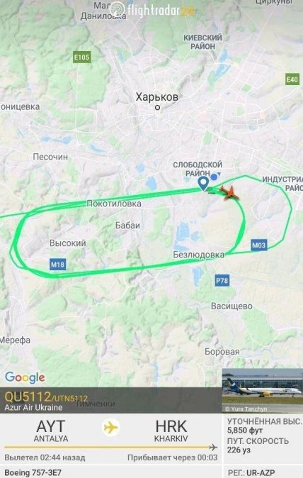 Как показывают данные сайта Flightradar, самолет Azur Air Ukraine (QU5112/UTN5112) сделал несколько кругов над зоной посадки.
