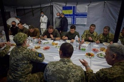 На опубликованном Офисом президента фото Зеленский и глава ОП едят за столом в окружении военных. Сами же бойцы сидят за столом без тарелок.