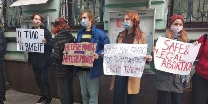 Люди держат плакаты с надписями: "Не тебе рожать - не тебе решать", "Ее тело - ее выбор", "Женщина имеет право распоряжаться своим телом!".