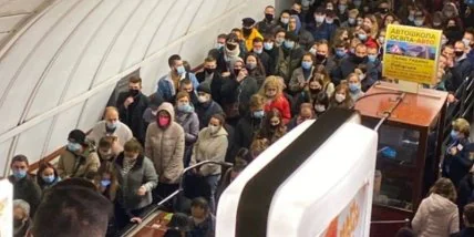 На станциях в центре города образовалось большое скопление людей, что вызвало иронические комментарии о скором попадании Киева в "красную зону" карантина из-за распространения коронавируса.