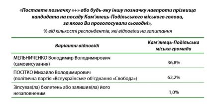 В Камянец-Подольском самовыдвиженец Владимир Мельниченко проигрывает кандидату от "Свободы" Михаилу Поситко.