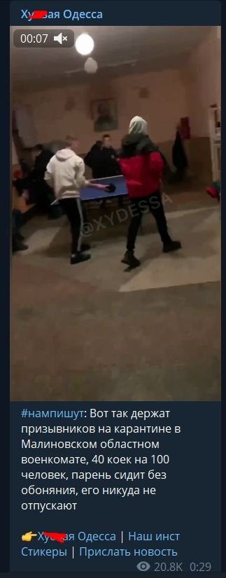 В Малиновском областном военкомате города Одесса призывники, находящиеся на карантине, находятся в одном помещении в жутких условиях.