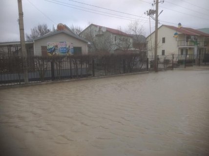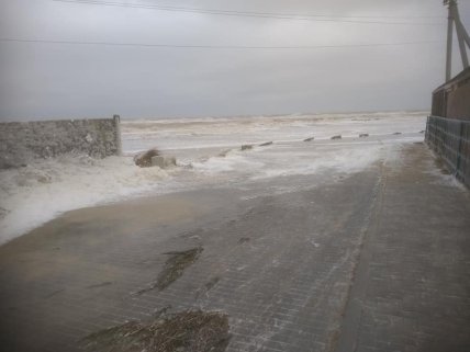 В Азовском море разбушевался шторм неподалеку от популярной базы отдыха Крилловка. В частности водой затопило дорогу на остров Бирючий, где расположена резиденция президента Украины Владимира Зеленского.