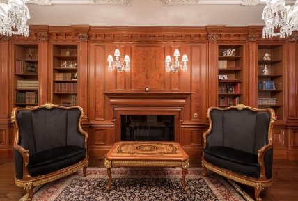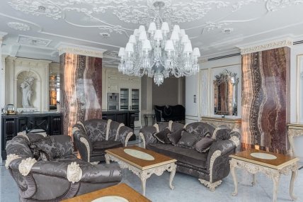 "Роскошные" апартаменты включают в себя: спальню, гардеробную, мастер санузел; будуарную гостиную с зоной бара, а так же общий холл с библиотекой в которой размещена коллекция хрусталя Lalique и Baccarat, антикварные статуэтки и коллекция уникальных книг.