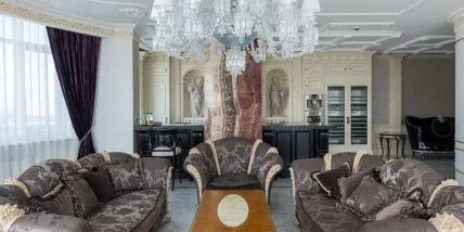 "Роскошные" апартаменты включают в себя: спальню, гардеробную, мастер санузел; будуарную гостиную с зоной бара, а так же общий холл с библиотекой в которой размещена коллекция хрусталя Lalique и Baccarat, антикварные статуэтки и коллекция уникальных книг.