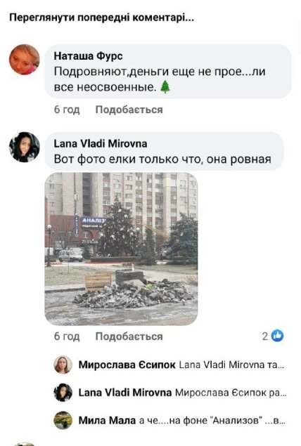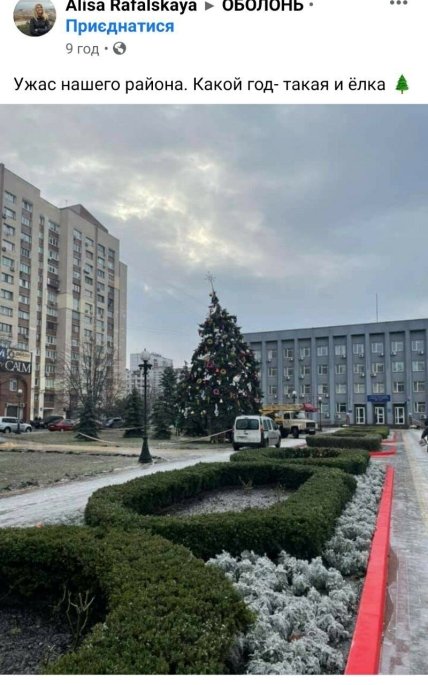 Например, пользовательница социальной сети "Фейсбук" привела в маленький шок своих читателей постом о новогоднем дереве, которое установили на Оболони.