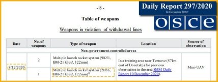 РСЗО была замечена с мини-беспилотника ОБСЕ 8 декабря 2020 года возле населенного пункта Терновое в 57 километрах от Донецка. Об этом говорится в отчете СММ №297/2020 от 14 декабря 2020 года.