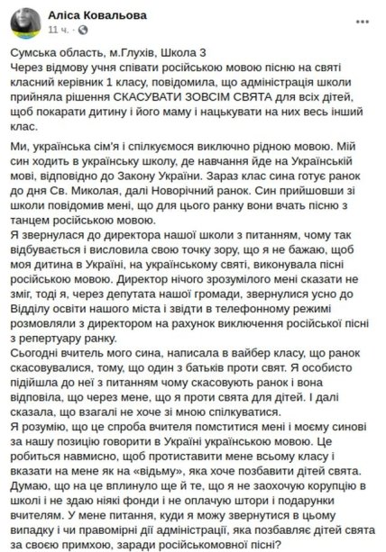 В Глухове Сумской области из-за отказа ученика петь русскую песню на празднике в школе решили совсем отменить праздники для всех детей. Это было сделано для того, чтобы наказать ребенка и его маму и натравить на них остальной класс.