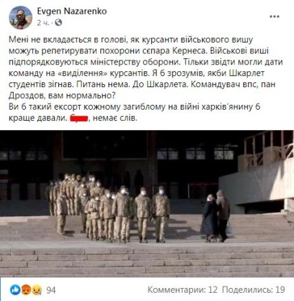 Однако для некоторых пользователей сети привлечение курсантов показалось недопустимым. В частности негодование выразил в Фейсбук журналист Евгений Назаренко.