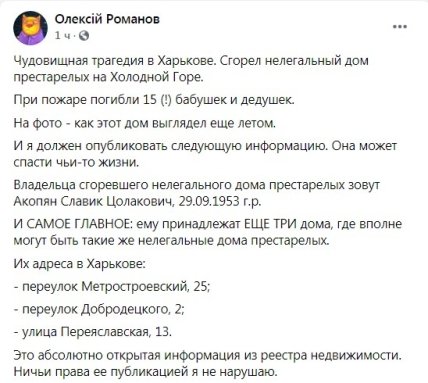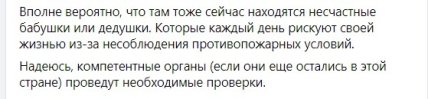 "Ему принадлежат еще три дома, где вполне могут быть такие же нелегальные дома престарелых. Вполне вероятно, что там тоже сейчас находятся несчастные бабушки или дедушки, которые каждый день рискуют своей жизнью из-за несоблюдения противопожарных условий", - написал он, указав адреса домов.