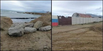 На фото можно увидеть ограждения, которые перекрывают проход к пляжу. В то же время плавный спуск к пляжу, по которому раньше люди ходили с детьми, ныне завален камнями. Неподалеку также виднеются какие-то постройки.