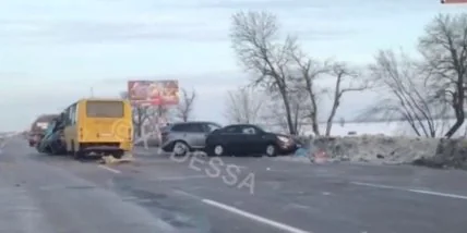 В воскресенье, 31 января, на выезде из Одессы в сторону Киева, напротив торгового центра "Новая линия" произошло ДТП: столкнулись три машины и автобус.
