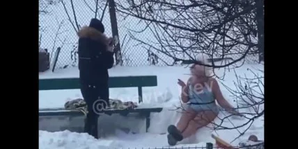 На кадрах действительно видно женщину в возрасте, которая в купальнике и в приличный мороз сидит на снегу, по всей видимости, рассказывая о закаливании. Со стороны женщину снимает на камеру другой человек.