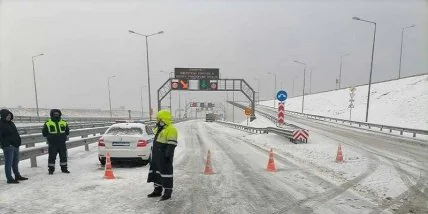 Движение по Крымскому мосту перекрыто из-за снегопада и плохой видимости в обоих направлениях впервые после завершения строительства.