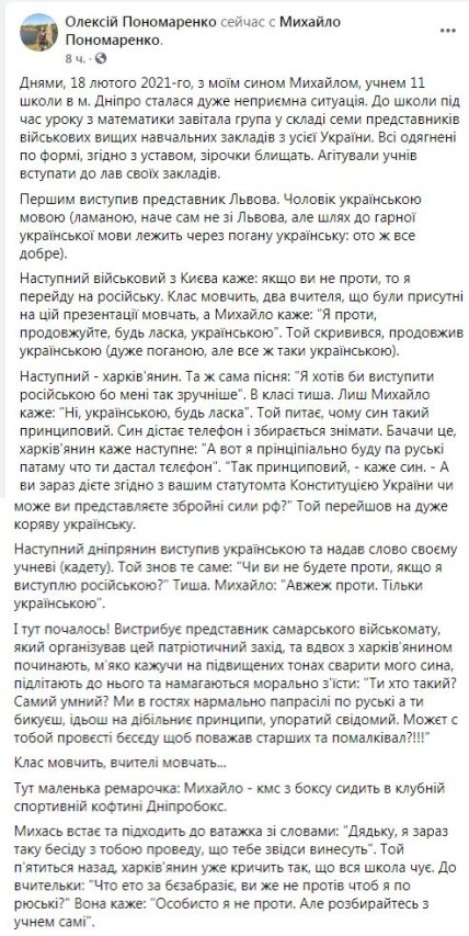 Пономаренко пишет, что никто из класса, включая двоих учителей не возразили военным, кроме его сына, который высказался против, а потому киевлянин продолжил говорить на украинском.