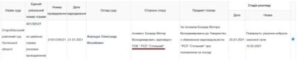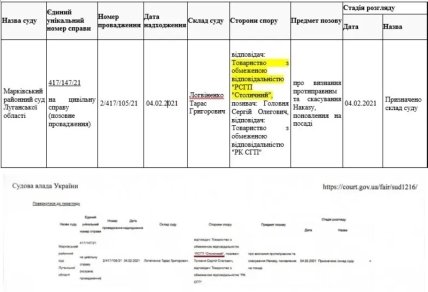 – Совершенно точно. Повторная попытка получения "по тихому" судебного решения произошла уже в середине февраля 2021 года, когда уже некий Головня Сергей Олегович подал иск к ООО "РСГП "Столичний" о возобновлении в должности директора в Марковский районный суд Луганской области. История в этом случае повторилась полностью: в размещенной 12 февраля на портале "Судебная власть Украины" название ответчика также было искажено – на ООО "РК СГП".