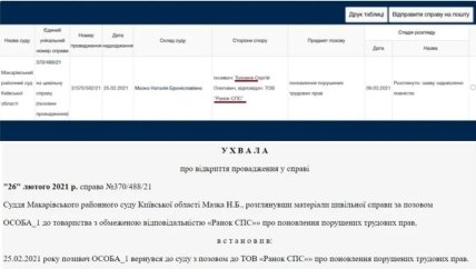 Здесь, чтобы скрыть факт иска, исказили не только название предприятия, но и имя истца. Согласно изначально внесенным в реестр данным, некто Толовня Сергій Олегович подал иск к ООО "Ранок СПС". И судья Мазка уже 26 февраля открыла производство именно от этого истца к несуществующему в природе предприятию.