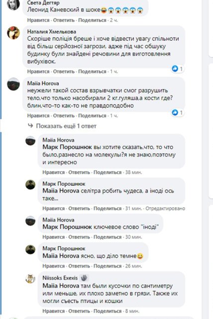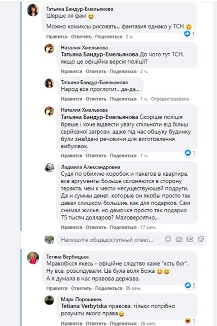 А еще рассказывают о своих сомнениях и выдвигают собственные версии: "Судя по обилию коробок и пакетов в квартире, все аргументы больше склоняются в сторону теракта, чем к мести несуществующей подруги. Да и суммы денег, которые он якобы просто так давал, слишком большие, как для подарков. Сам снимал жилье, но дамочке просто так подарил 75 тысяч долларов? Маловероятно...", "Скорее, полиция врет и хочет отвести внимание общественности от более серьезной угрозы, ведь во время обыска дома были найдены вещества для изготовления взрывчатки", "Пожалуй, только фастовское райуправление полиции умеет так быстро выяснить все о человеке и его подруге, о которой, кстати, соседям в округе ничего не известно. Прямо какие-то экстрасенсы - за полдня уже и результаты экспертизы и все обстоятельства выяснены. Кто этому верит?", "Больше похоже на обсуждение фильма. Есть вера в эту версию?".