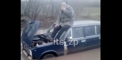В Запорожской области водитель пытался "переплыть" лужу, но лишь позабавил сеть.