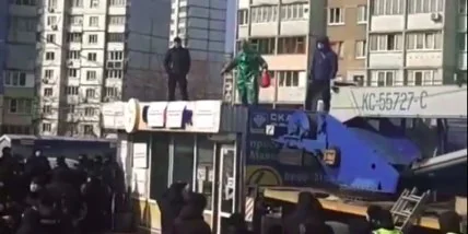 В Киеве на Троещине мужчина залез на свой ларек, облился бензином и грозился себя поджечь, защищая свое имущество.