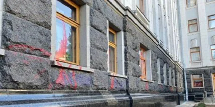 Клининговой компании удалось отчистить табличку "Президент Украины" и отмыть большую часть фасада здания от брани и нецензурных надписей, сообщает ASPI news.