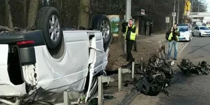В четверг на Житомирской трассе на выезде из Киева легковушка "догнала" микроавтобус с семьей, от чего последний перевернуло и раскурочило, пострадали двое детей.