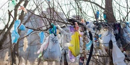 Посреди мусорной свалки внимание фотографа привлекла необычная картина. Огромное количество использованных медицинских масок и полиэтиленовых пакетов привязанных к веткам деревьев.