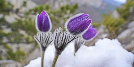 На горе Мердвен-Кая зацвели подснежники, хотя там все еще продолжает лежать снег.