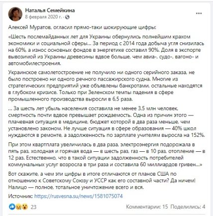 Ранее же - в 2020-м - Семейкина опубликовала в Facebook пост со ссылкой на "руководителя" так называемого "Центрального исполкома Общественного Движения "Донецкая Республика" Алексея Муратова о крахе украинской экономики.