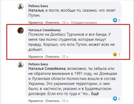 В результате, между женщинами завязалась дискуссия. Семейкина написала, что рассуждения автора о Путине и русскоговорящих украинцах - якобы "выпендреж", и куда, мол, "не лезут украиноязычные".