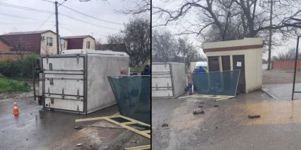 В Одессе, в Суворовском районе произошло ДТП: грузовик съехал с дороги и влетел в торговый киоск, снеся дорожный знак и ограду.
