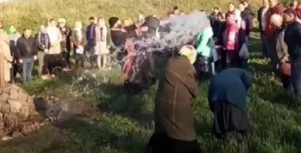 В Боровском районе Харьковской области священник забыл взять на освящение крест, кадило и свечи, а людей "освятил" весьма оригинальным образом: просто облил их всех из ведра.