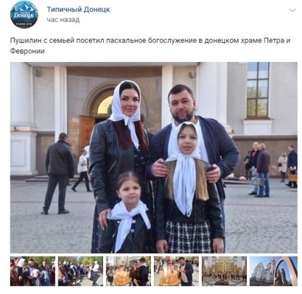 "Пушилин с семьей посетил пасхальное богослужение в донецком храме Петра и Февронии", - говорится в сообщении.