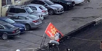 В Амур-Нижнеднепровском районе Днепра 2 мая неизвестные вывесили фасаде двухэтажного здания флаг с запрещенной в Украине коммунистической символикой и большим портретом Иосифа Сталина (Джугашвили) на нем.