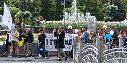 В центре Киева в субботу, 15 мая, днем прошло немногочисленное шествие против вакцинации от коронавируса COVID-19.