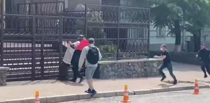В Киеве демонстранты пытались закидать посольство Беларуси фекалиями.
