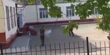 "Муниципальная варта ПРИМЕНИЛА оружие на территории 1 школы в Черноморске, когда ловили неизвестного парня, который бегал по двору, пытаясь убежать", - говорится в сопровождающем видео подписи.