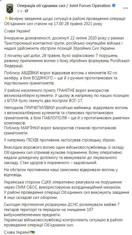 По состоянию на 17:00 противник нарушил режим прекращения огня 7 раз, применив стрелковое оружие, крупнокалиберные пулеметы, противотанковые и подствольные гранатометы. Также возле Гранитного гранаты ВОГ-17 были сброшены на позиции ВСУ с беспилотника.