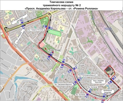 Так, трамвайный маршрут №2 "Проспект Академика Королева – станция "Ромена Роллана" будет следовать по следующей схеме: просп. Академика Королева - ул. Симиренко - б-р Кольцова - ул. Владимира Покотило - просп. Леся Курбаса;