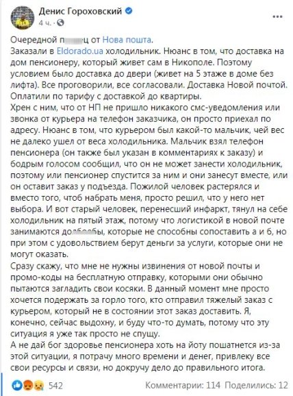 По его словам, доставку холодильника заказал одинокий пенсионер из Никополя, который перенес инфаркт. В условиях заказа было оговорено, что курьеры донесут заказ до двери, однако получилось иначе.