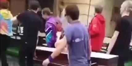 На видео видно, что внутри гроба сидит голая девушка с выкрашенными в яркие цвета волосами. Впереди идут мужчина с плакатом и другая девушка с камерой.