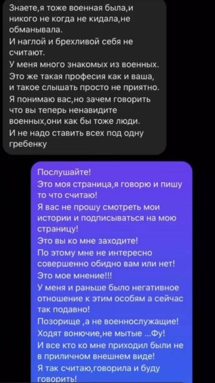 Впрочем, там же появился скриншот переписки, в котором она назвала военнослужащих "позорищем".