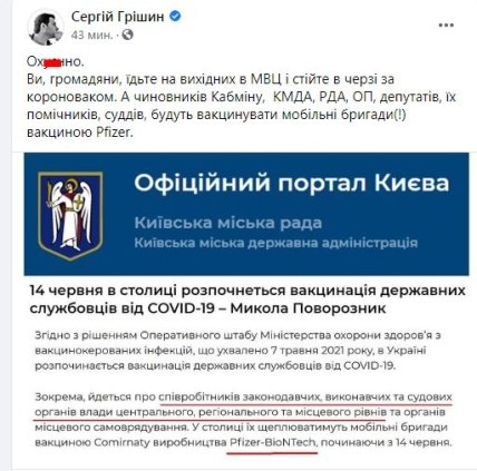 "Ох**нно. Вы, граждане, езжайте на выходных в МВЦ и стойте в очереди за коронаваком. А чиновников Кабмина, КГГА, РГА, ОП, депутатов, их помощников, судей, будут вакцинировать мобильные бригады (!) вакциной Pfizer", - написал журналист Сергей Гришин.