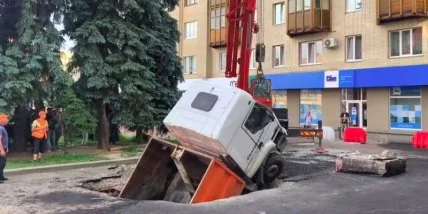 В Житомире во время ремонта дороги грузовик провалился под землю (видео)