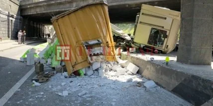 В свою очередь, фура, зацепившая легковушку, умчала дальше и через несколько десятков метров врезалась в опору и остановилась.