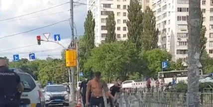 В Киеве на улице Ушинского неадекватный мужчина с ножом решил показать свои "бойцовские навыки" экипажу полицейских.