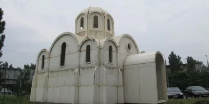 Как сообщается на странице епархии в Фейсбук, новый храм возле "Европорта" был построен из специального пенопласта всего за несколько часов.